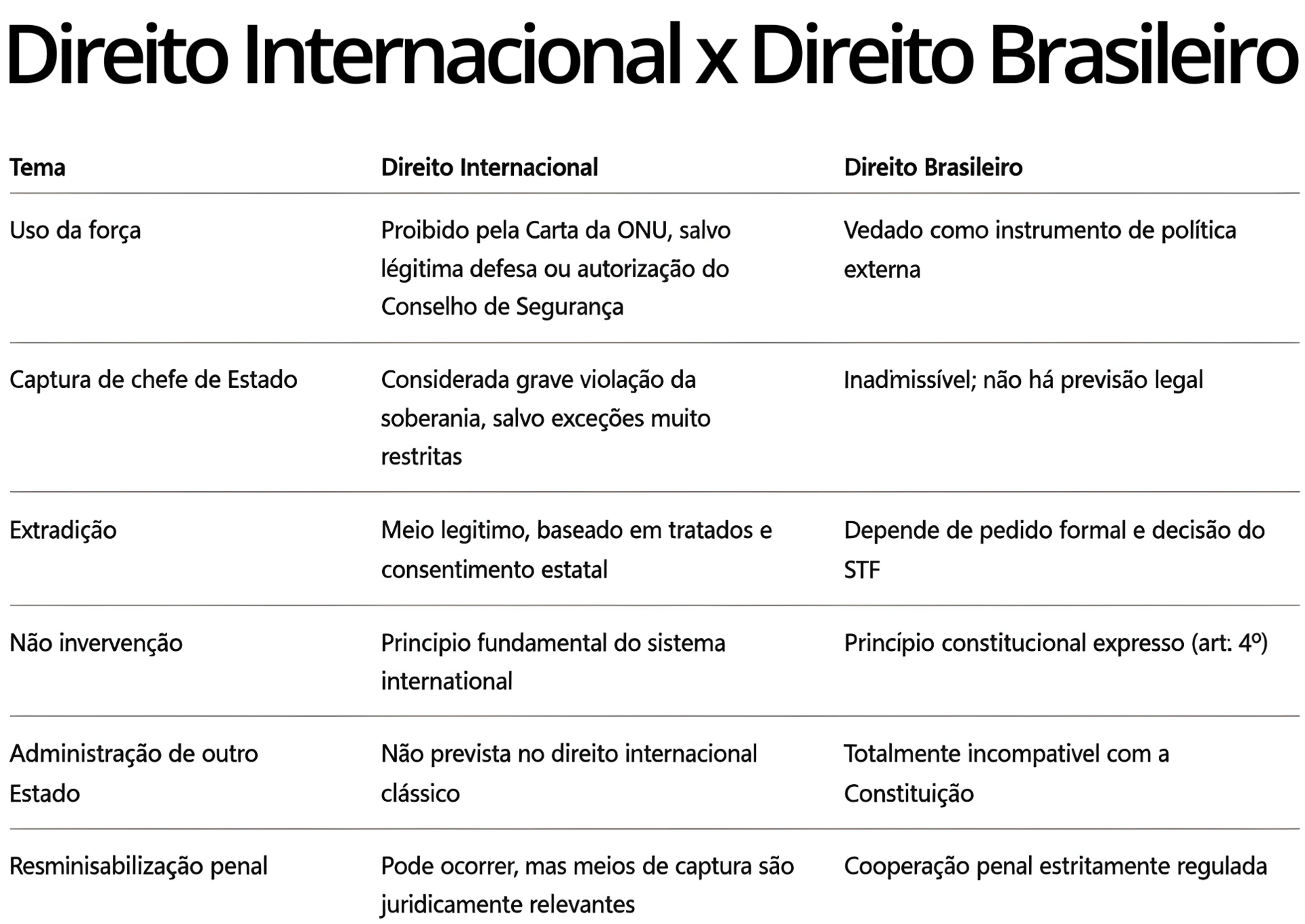 Comparativamente ao ordenamento brasileiro, não existe previsão que permita uma escala equivalente de intervenção militar estrangeira para captura de líderes estranhos, reforçando o entendimento de que tal ato viola normas de não intervenção que são centrais no direito internacional contemporâneo.