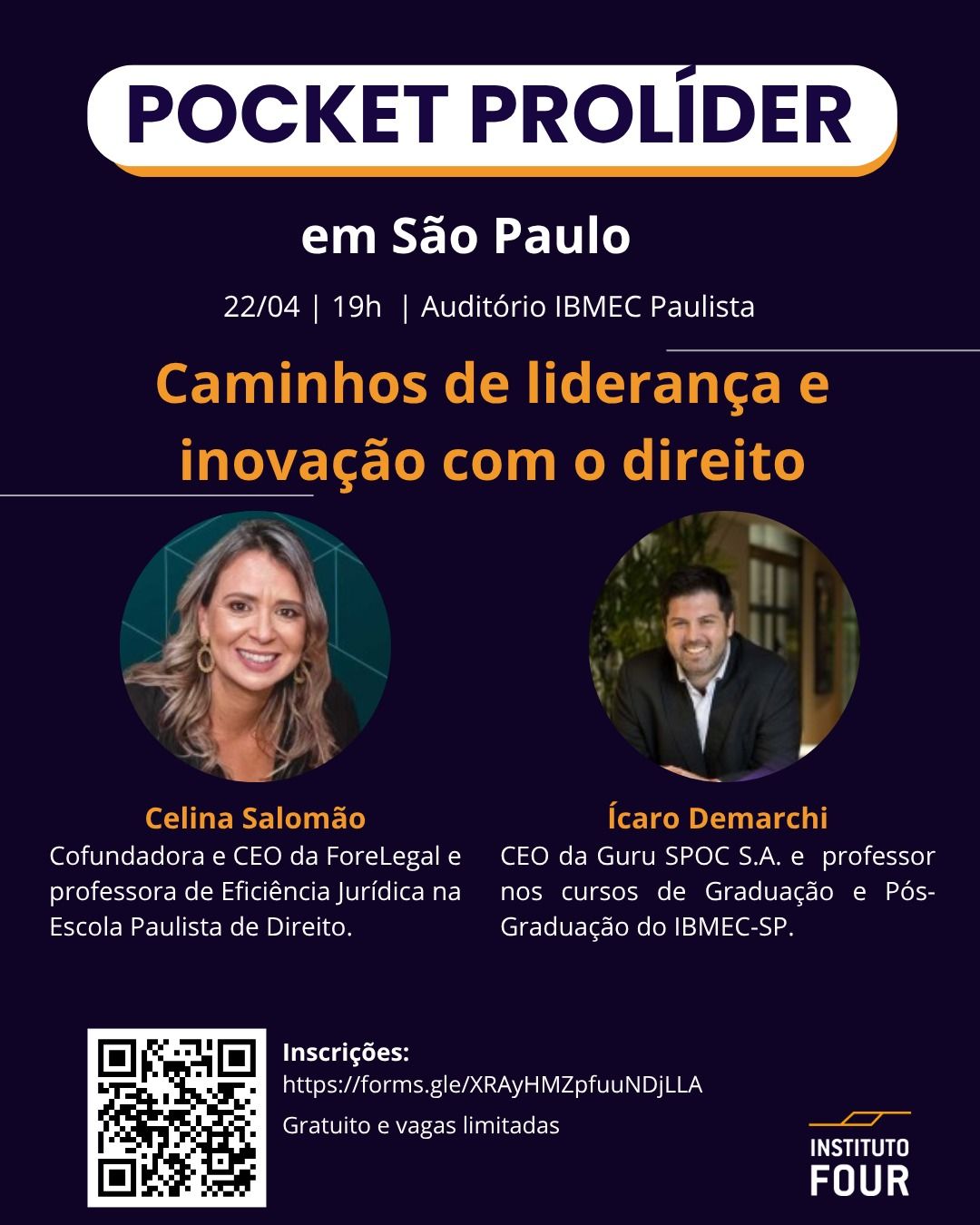 Mais tarde, às 19h, em São Paulo, a Lawletter apoia e media um encontro diferente: o Pocket ProLíder, do Instituto Four, no Ibmec Paulista.