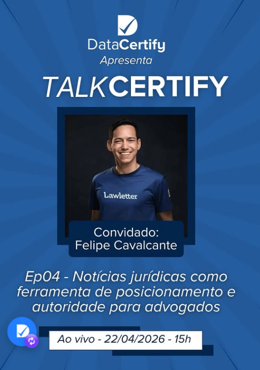 Hoje é um deles. Às 15h, a Lawletter te leva para dentro de uma conversa que ajuda a entender como advogados estão construindo autoridade a partir da informação. Felipe Cavalcante, co-fundador da Lawletter, participa do TalkCertify, da DataCertify, ao vivo no YouTube, um daqueles encontros que mudam a forma como você enxerga o próprio posicionamento. Se fizer sentido, vale se inscrever no canal para acompanhar às 15h. | ![]() |
